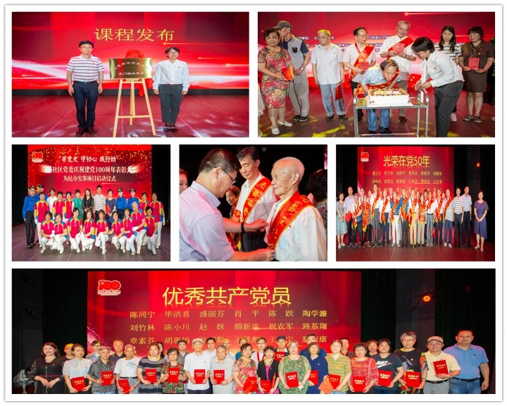 现场活动中,玄武老年开放大学北门桥办学点——山水情艺术团为大家带来的音诗舞蹈表演《唱支山歌给党听》、朗诵班师生的诗歌朗诵《光的赞歌》,情景剧《永不褪色的红》、体育舞蹈《我和我的祖国》、老年模特队带来的服装秀《我爱你,中国》,通过一首首赞歌“礼赞篇”,歌颂了中国共产党勇于革命、敢于胜利的宝贵精神,饱含对祖国无限忠诚的爱,表达对党一百年来筚路蓝缕奠基立业的崇高礼赞。在“庆贺篇”中,为14位整十年政治生日党员,党龄最小已有10年,党龄最大60年。政治生日的“寿星”们受邀上台,集体过党员生日,全体党员起立,重温入党誓词,对党忠诚的誓言,句句铿锵有力、饱满热忱。整场活动高潮迭起,也获得场下党员观众们的热烈掌声。