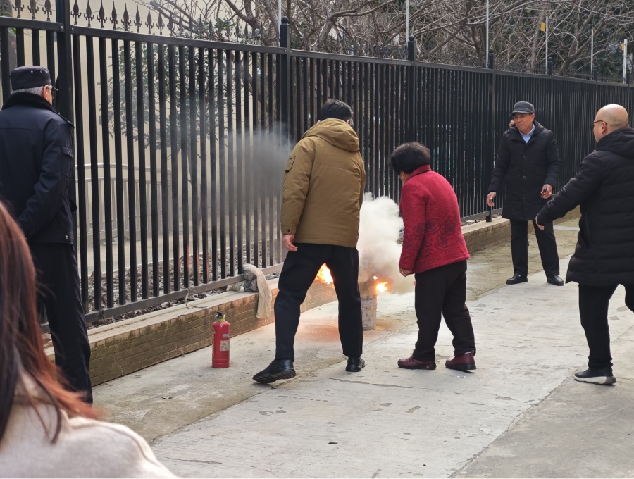 第二阶段,由陶主任和杨警官共同讲解了消防器材的正确使用方法,并鼓励大家认真观摩、实际操作消防器材,积累操作经验。随后宿舍舍长、消防志愿者、门卫和宿舍管理员等依次演练用灭火器扑灭明火。最后,陶主任为师生介绍遇到火灾后的正确处理方式,尤其是如何防患于未然。