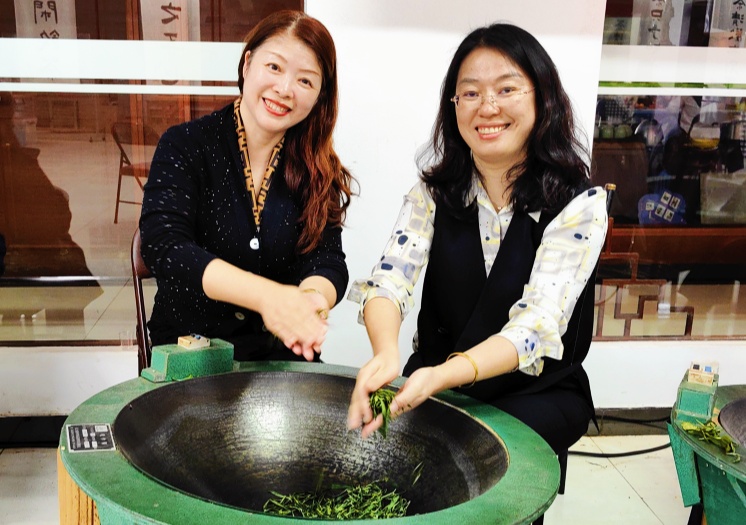 10月21日下午,与会同志实地参观玄武区居民终身学习体验基地——盛峰茶业有限公司,体验被收录人类非物质文化遗产保护名录的雨花茶制作技艺,跟着雨花茶制作技艺传承人陆葵香老师学习雨花茶的制作技艺,亲手炒制雨花茶。