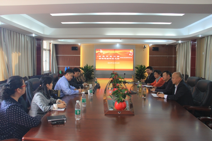 座谈会上,业冰校长代表学校对江金山总执行长一行的到来表示热烈的欢迎,希望两校积极深入地推进校际合作项目的发展。业校长从学校规模、办学目标、专业设置、学生培养、博雅教育、转型发展等方面简要介绍了学校的基本情况。随后,江金山总执行长和陈铉文副处长分别简要介绍了建国科技大学的概况及近年来两岸高校合作交流的成果。接着,双方就如何加快推进教师与学生赴台进行学术访问与短期研修项目进行了广泛深入的座谈与交流。双方表示将进一步深化合作层次,扩大合作领域,实现优势互补,资源共享,互利共赢。