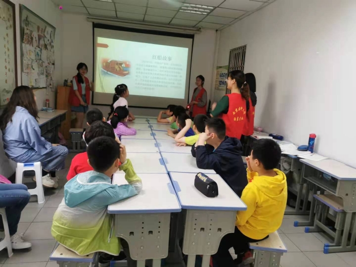 活动中,南医大志愿者结合幻灯片为大家讲解了伟大的中国共产党的诞生,着重讲解了“红船”故事。通过志愿者的讲解,孩子们了解到1921年,中国共产党第一次全国代表大会在浙江嘉兴南湖的一条游船(后称“红船”)上胜利闭幕,庄严宣告中国共产党的诞生。红船,它是中国革命的诞生地,100年前中国共产党在这里诞生,并在这艘船上轻声地呼出了时代的最强音。孩子们听的特别认真,爱国的种子也在无形中播撒在孩子们心间。