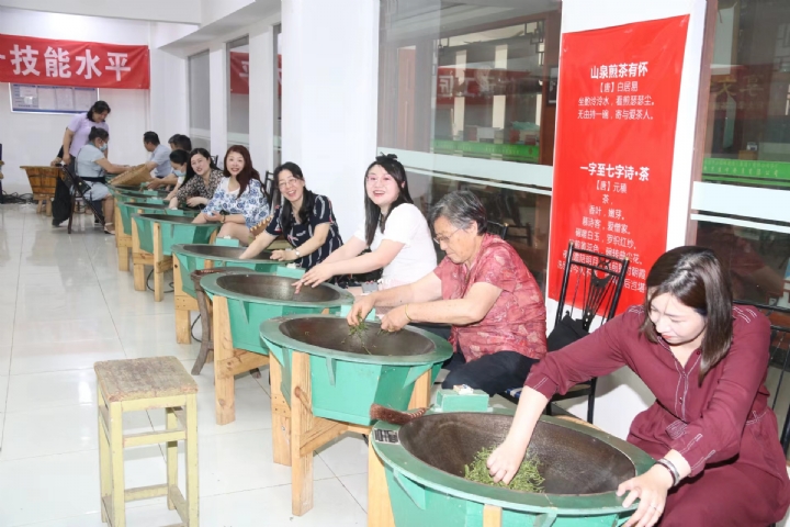 参加活动的社区党员和居民,来到FH(集团)体育官方网站“茶道养生”学习体验基地南京盛峰茶业有限公司,这里也是国家级非物质文化遗产雨花茶制作技艺保护单位。在茶艺师的示范和指导下,先将刚经过杀青的鲜叶进行揉捻,只见大家双手握住茶叶在细蔑竹筐上来回推滚,动作先轻后稍重,先慢后稍快,经过十多分钟的揉捻,进入了手工炒茶过程,现场十几口炒锅同时开启,经过揉捻的鲜叶在锅中翻炒,学习者在老师的指导下,反复翻炒,锅底的绿叶逐渐干缩,颜色渐深,从翠绿转向碧绿、墨绿,现场散发出茶叶清香。经过一个多小时的体验式学习,大家亲手炒制的雨花茶就诞生了,虽然条型不是那么标准的“紧、细、圆、直”,当大家看到自己亲手炒制的“作品”新鲜出炉,还是收获感满满。