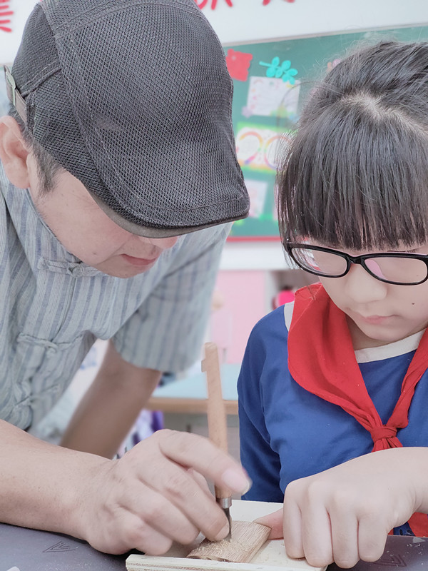 有了上一周的初步感知和了解,同学们对这两门非遗课程不再陌生。今天课上,两位非遗传承人直奔主题,带领学生亲身体验非遗魅力。何胜老师先给每个学生发了一套专用刻刀和他自制的防护器具,随后给每个学生发了一块未打磨的竹牌。让学生学习刻刀的正确使用,通过铲平竹牌表面这道工艺,体会一件竹刻作品完成的不易。谷馆长巡视课堂,提醒学生注意安全,正确使用刻刀,并悉心指导、耐心讲解。一节课的时间过得很快,同学们顺利完成了竹刻的第一步,掌握了刻刀的最基本刀法的运用。