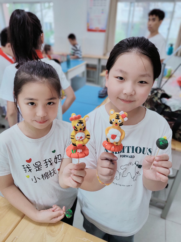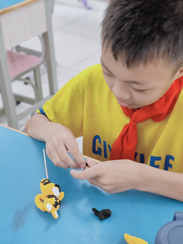 何斌老师的课堂较为灵动,为了方便学生入门,何老师选用超轻黏土作为泥塑的原材料,以虎年民俗入手,教学生捏制福虎。从调色到塑形、雕琢、美化,一系列操作过后,一只卡通福虎从指尖诞生,不仅培养了学生的动手能力,还给予学生美的熏陶,激发了学生对中华传统文化的热爱。