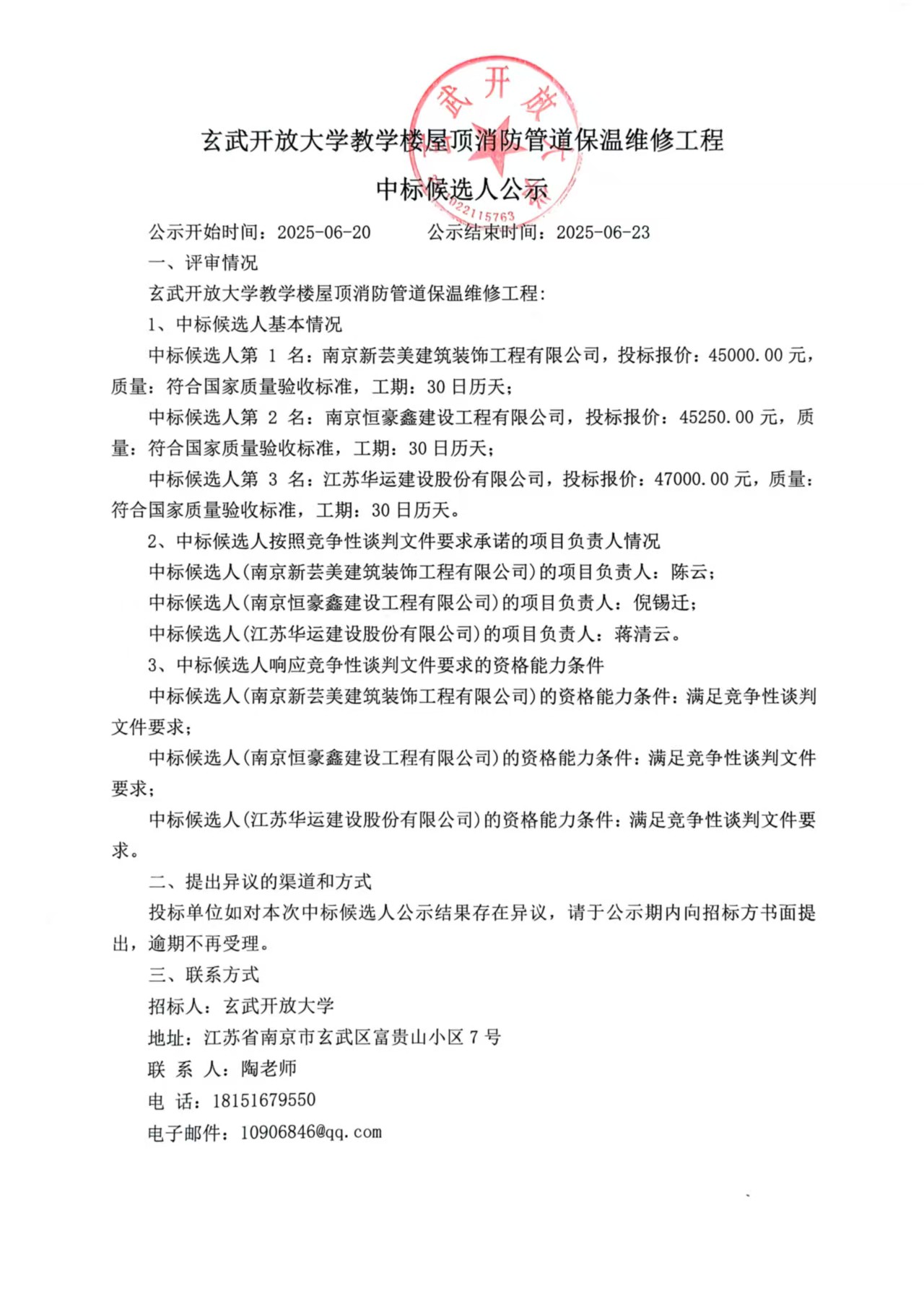 FH(集团)体育官方网站教学楼屋顶消防管道保温维修工程中标候选人公示