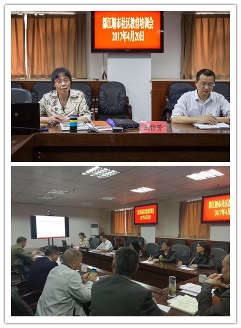 本次交流研讨得到了都江堰市教育局副局长吴介才、都江堰市社区教育学院副院长谢颖等领导的热诚接待。20日上午的交流研讨中,谢颖院长以《学习发达地区经验 推进社区教育发展——都江堰市社区教育学院工作》为题,从都江堰市基本情况、都江堰市社区教育发展概况、都江堰市社区教育发展面临的瓶颈及后续发展的思考等方面阐述了该市社区教育依托当地丰富的社区教育资源,从“一乡(镇、街道)一品”打造,走区域特色发展之路,从水文化体验、衍纸、青城武术、儒家六艺、国学进社区、盆景之乡游学、茶文化游学等创成都市特色项目所取得的可喜的成果,做了详细地介绍。玄武区业院长、王主任向都江堰赠送了玄武区社区教育读本及专著,与都江堰市各位领导、老师就大家提出的社区教育发展的机制体制问题、社区教育学院建设问题(人员编制、经费、职能机构)、“四个中心”:(课程开发、教育示范、业务指导、教育研究)、社区教育课程开发(人员、经费、研究、教材、授课)等问题进行了深入的交流与沟通,期间王主任还重点介绍了玄武区社区教育的发展概况。20日下午,玄武区王主任送教上门,给都江堰市社区教育干部们以《区域社区教育发展的谋划与主要做法》为题进行了专项培训和辅导,使在场的干部们受益匪浅,一致表示听了王主任的讲座后对如何开展社区教育培训、课程编撰、项目实验等工作有很大的帮助。与此同时,业院长、沈青主任等和谢颖院长、孙洪远书记等领导就东、西部双方在今后如何开展教育机构的深入合作联盟进行深入交流研讨,双方围绕“分享互助 共同发展”-——玄武区与都江堰东、西部合作总体目标, 就今后的合作事项进行了深入探讨,并从课程资源建设、师资队伍培训、特色项目培育、数字化平台等具体方面畅谈了合作共建对达成共识。谢院长希望玄武区配合都江堰市创建国家级社区教育实验区给予帮助。吴局长、谢院长一再表示感谢玄武区将社区教育创新理念和成功经验传经送宝到都江堰市。