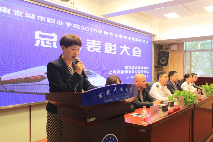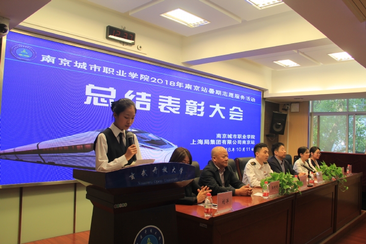 2018年10月11日中午12:15,南京城市职业学院玄武分校2018年南京站暑期志愿服务活动表彰大会在207多媒体教室召开,南京站团委吴康平书记,学校张树明副校长、李青校长助理、杨丽霞副主任,江苏动铁集团刘晓天总经理,刘洋副总经理、马丽娅部长、刘彬老师和17 级旅游管理专业、18 级酒店管理专业学生参加本次表彰大会,江苏动铁集团缪晓娟老师主持本次表彰会。