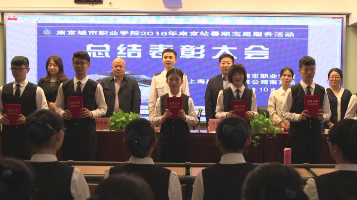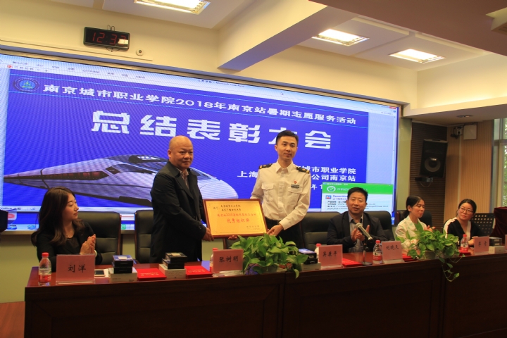 表彰会上,首先由江苏动铁集团马丽娅老师对本次暑期实践活动进行了总结,和学生一起观看了学生暑运实习小视频。张树明副校长宣读了表彰决定,南京站团委吴康平书记为玄武校区颁发“优秀组织奖”铜牌,主席台领导为荣获“突出贡献志愿者”和“优秀志愿者”的同学颁奖。