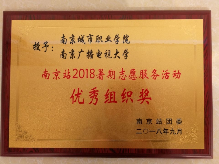 南京城市职业学院玄武分校喜获南京站2018年暑期志愿服务活动优秀组织奖