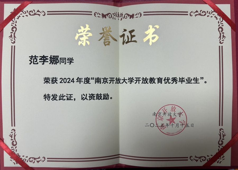 根据《关于开展2024年度南京开放大学优秀毕业生评选推荐活动的通知》相关文件精神,我校按照通知要求组织了2024年度优秀毕业生的初评和推荐工作。市校优秀毕业生评选小组评审并公示,决定授予我校范李娜学员“2024 年度南京开放大学FH(集团)体育官方网站优秀毕业生”称号。