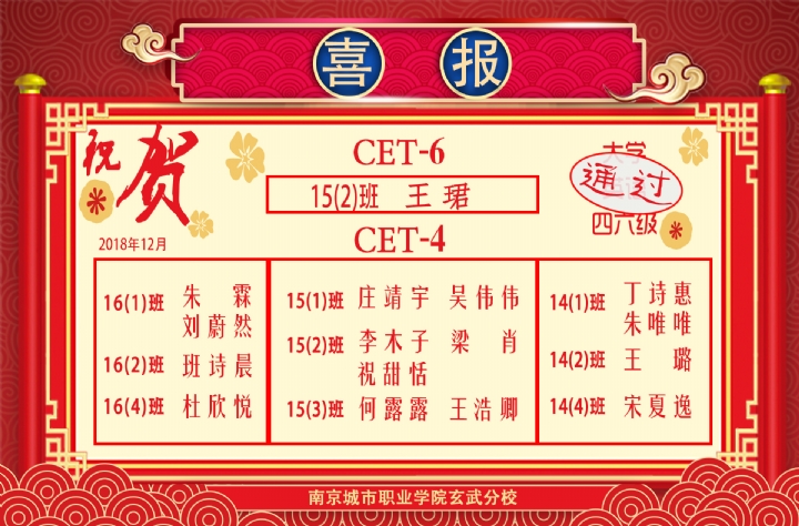 热烈祝贺以下同学顺利通过2018年12月大学英语四六级考试